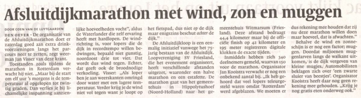 NHD, vrijdag 27 april 2007 Juf Tracy gaat zaterdag 28 april de Mararthon over de Afsluidijk lopen. De wedstrijd wordt gehouden omdat het 70 jaar geleden is dat de Aflsuitdijk aangelegd werd. Het parcours gaat van het gementehuis in Hippolytushoef in Noordholland naar het gemeentehuis in Witmarsum in Friesland De afstand is met ruim 44 kilometer zelfs nog iets langer dan de gewone marathon